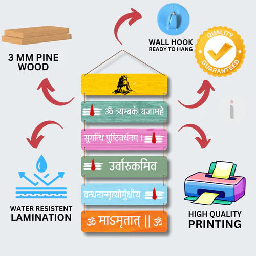 Elevate your space with the sacred power of the Mahamrityunjaya Mantra, beautifully showcased in this intricately designed wooden wall hanging. Known as the “Great Death-Conquering Mantra,” this powerful Sanskrit verse invokes Lord Shiva’s blessings for healing, protection, and inner strength.