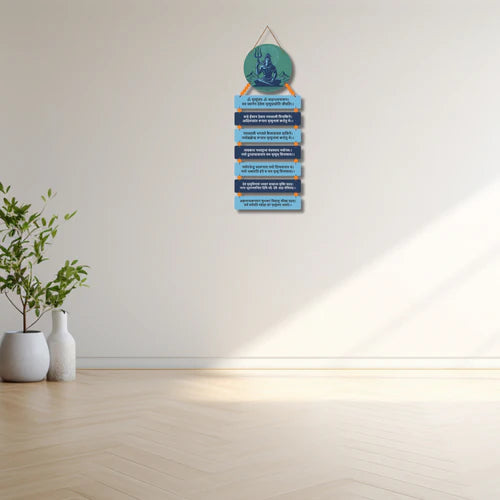 Invoke peace, healing, and spiritual strength with this beautifully crafted Mahamrityunjaya Mantra Wall Hanging. Featuring a serene illustration of Lord Shiva in meditation, each wooden strip showcases sacred Sanskrit verses from the powerful Mahamrityunjaya Mantra — revered for its ability to offer protection, longevity, and freedom from fear and suffering.