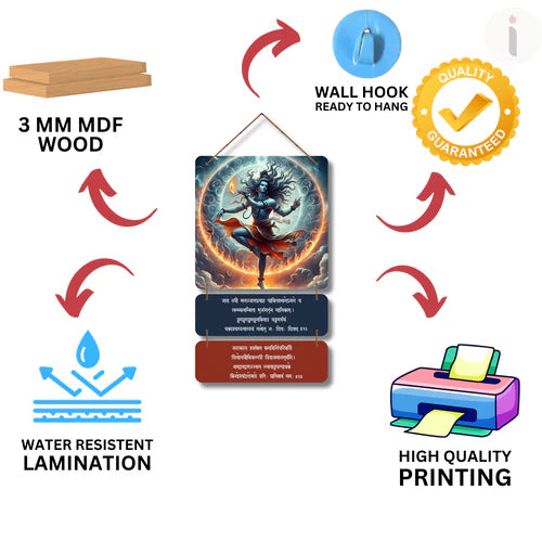 Shiva is depicted surrounded by flames of the cosmic fire, symbolizing the eternal cycles of the universe. Below this powerful visual, two intricately designed hanging panels feature revered verses from the Shiva Tandava Stotram, rendered in Sanskrit script, known for evoking divine power, focus, and spiritual devotion.