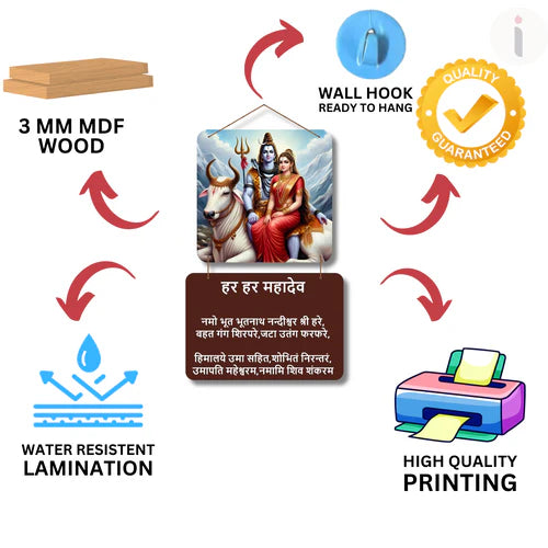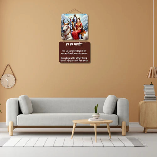 Beneath the captivating image is a wooden plaque inscribed with sacred Shiv Mantras in elegant Devanagari script, including the powerful "हर हर महादेव" chant and revered hymns of Lord Shiva. This piece radiates spiritual energy, making it perfect for prayer rooms, meditation corners, or as a meaningful gift for devotees.