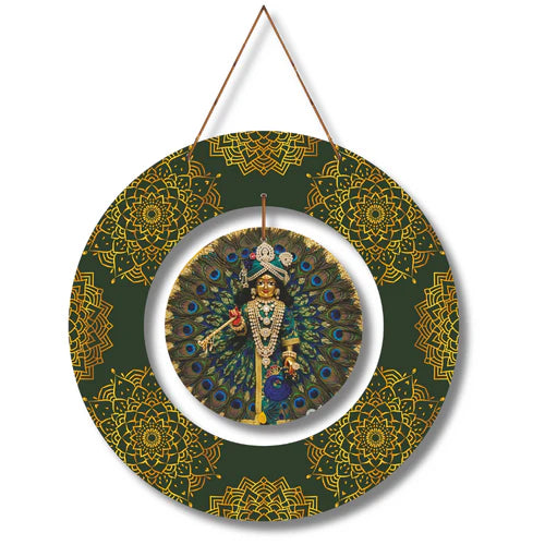 The divine image is encased within a lush green circular frame, surrounded by delicate golden mandala designs inspired by the timeless elegance of Pichwai art. This harmonious blend of color, culture, and craftsmanship makes it a stunning centerpiece for any devotional or decorative setting.